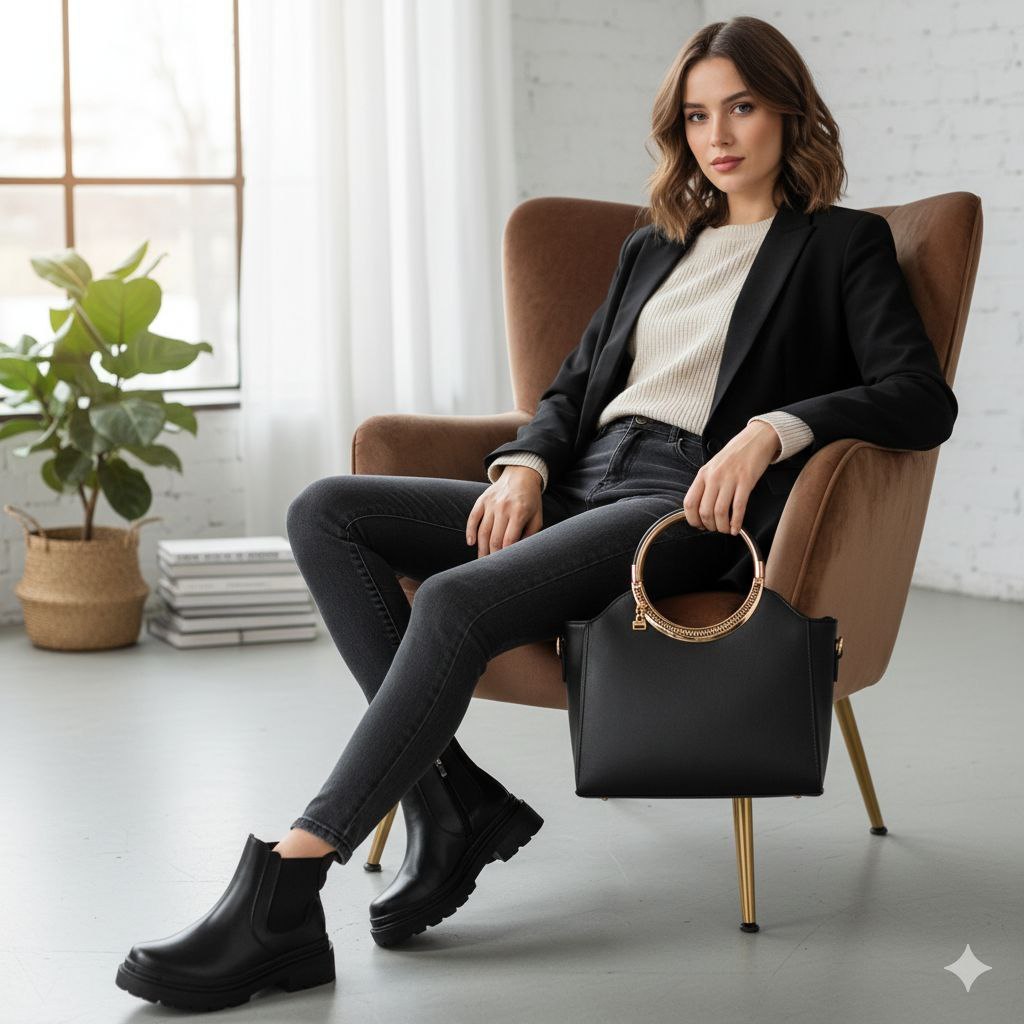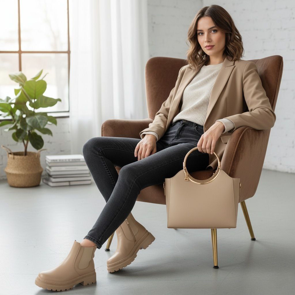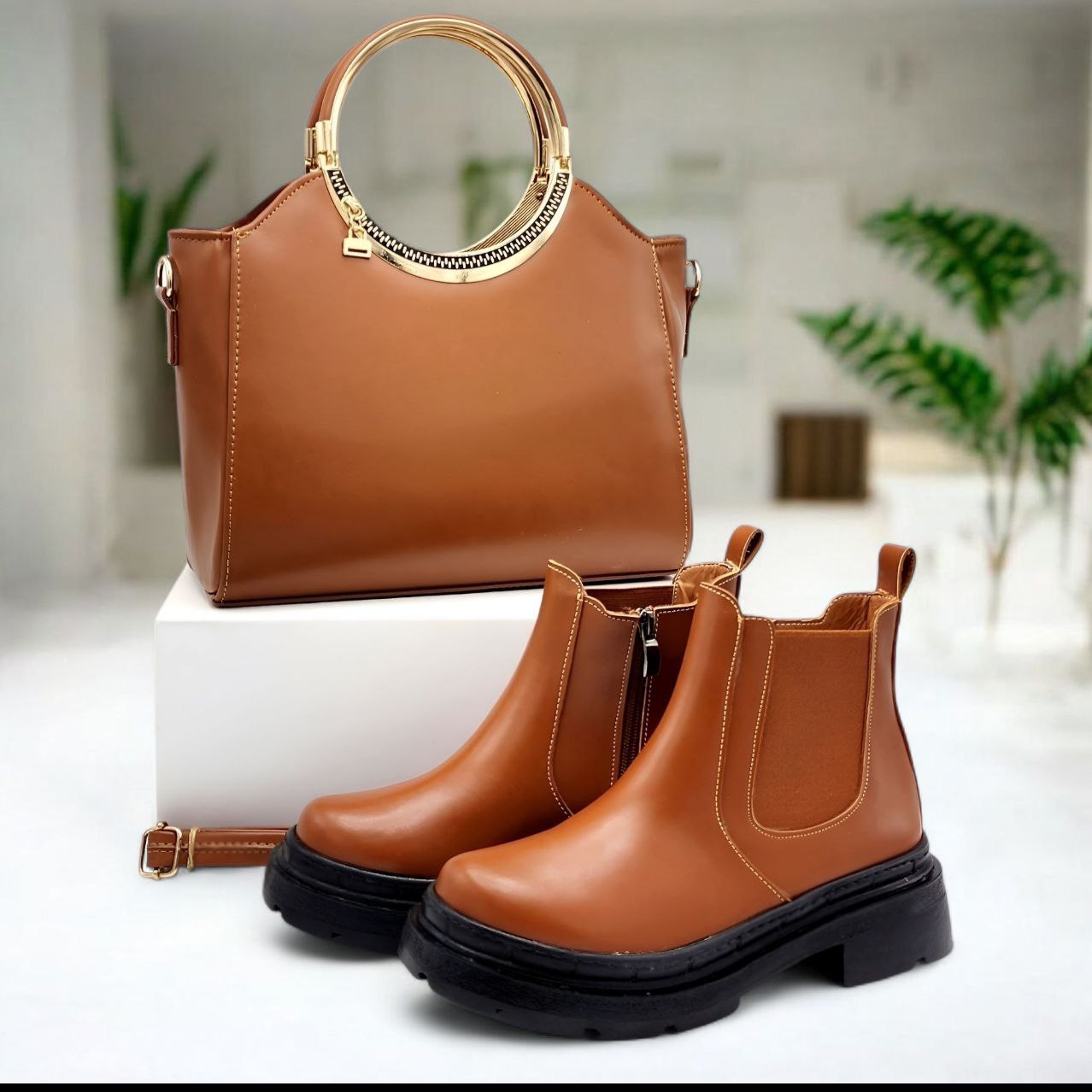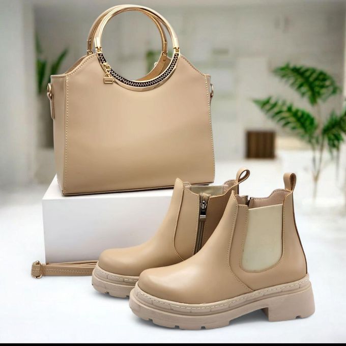 طقم حقيبة يد مع بوت كاحل بتصميم عصري يجمع بين الأناقة والراحة، متوفر بثلاثة ألوان أساسية تناسب كل الإطلالات: بيج ناعم، أسود كلاسيكي، وبني دافئ.