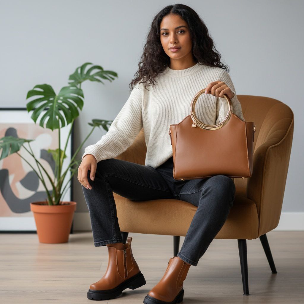 طقم أناقة يومية: حقيبة دائرية مع بوت كاحل عملي