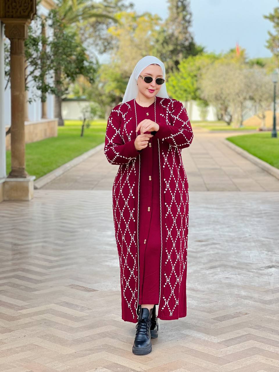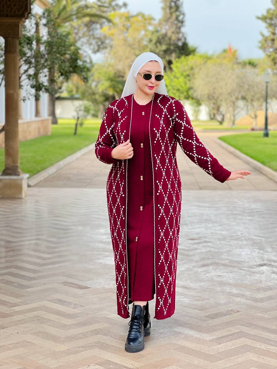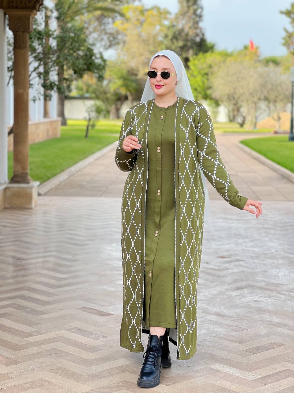 الطقم مكوّن من فستان طويل مع كارديغان مفتوح بنفس اللون والنقشة، ما يمنحك لوك متناسق جاهز بدون مجهود، من العمل اليومي إلى الخرجات العائلية والمناسبات البسيطة.