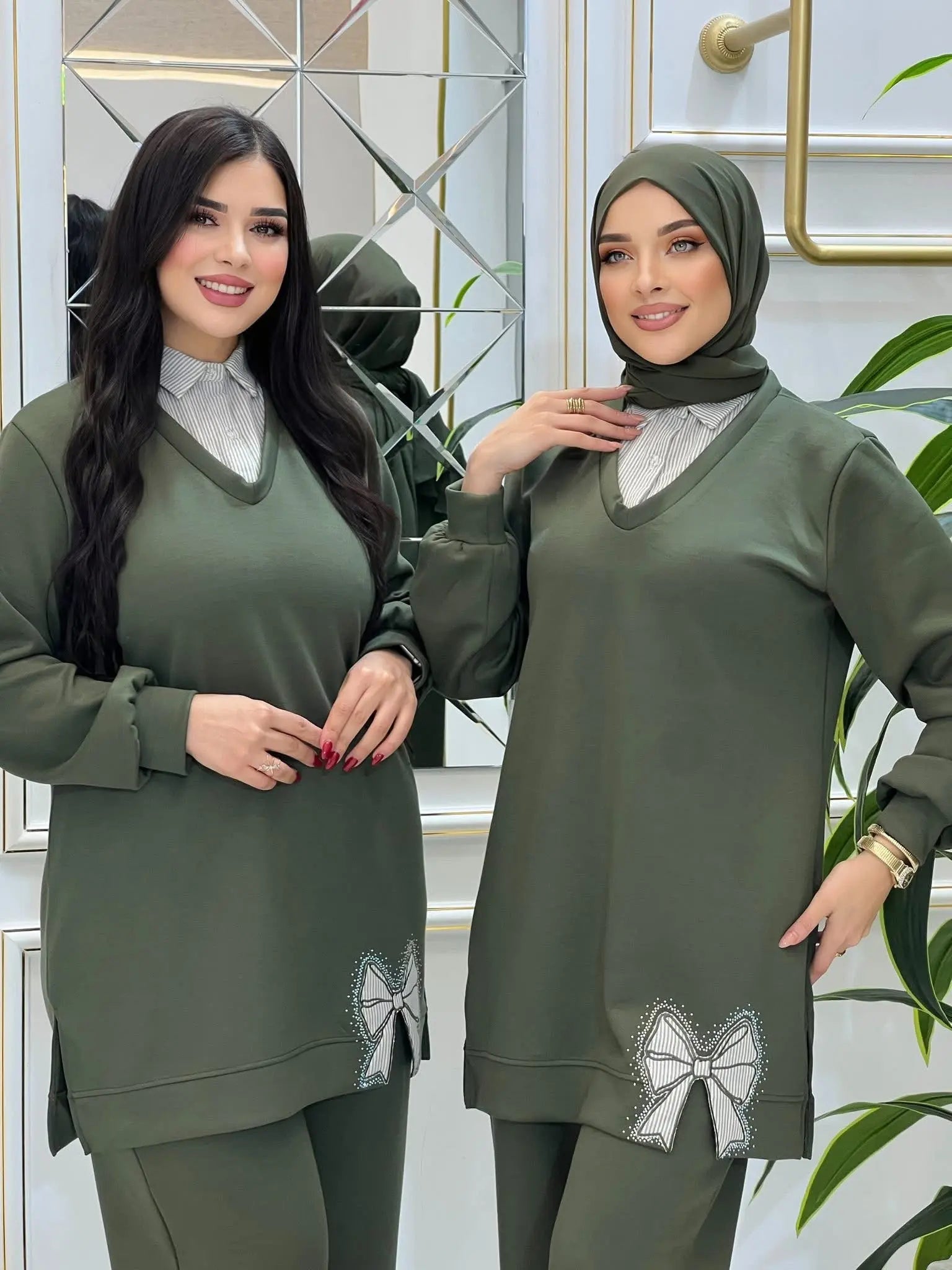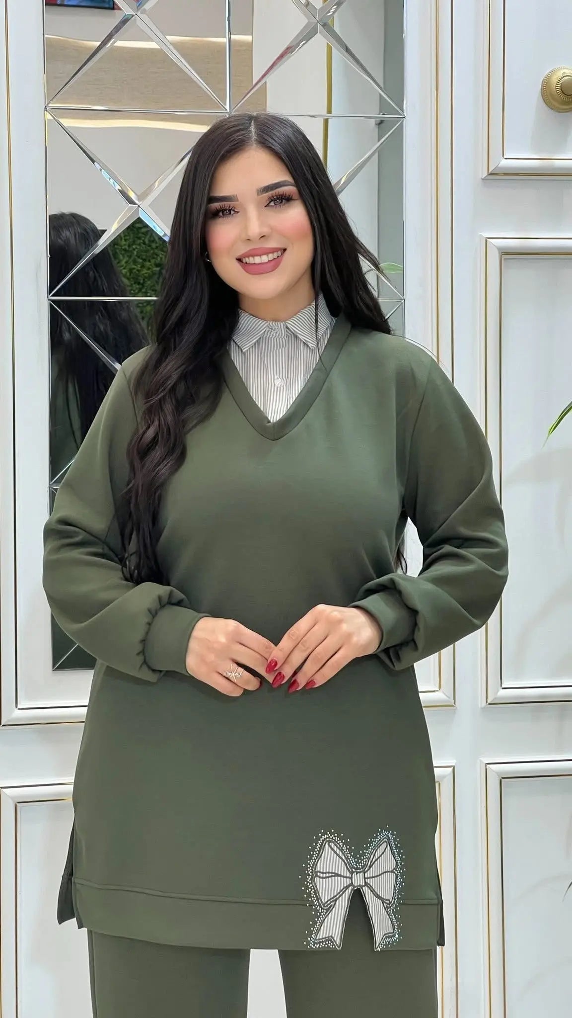 الطقم مكوّن من تونيك طويل وبنطلون واسع بقصة مستقيمة، يمنح تغطية ممتازة مع حرية كاملة في الحركة، ما يجعله مناسباً للمحجبات وغير المحجبات. تصميم التونيك بياقة على شكل V مع تفاصيل ياقة وقماش مخطط يعطي مظهر قميص تحت البلوزة بشكل جاهز بدون عناء التنسيق، لتظهري بإطلالة مرتبة في ثوانٍ. البنطلون الواسع يساعد على إخفاء عيوب الجسم ويعطي شكلاً منسدلًا وأنيقاً يناسب مختلف المقاسات.