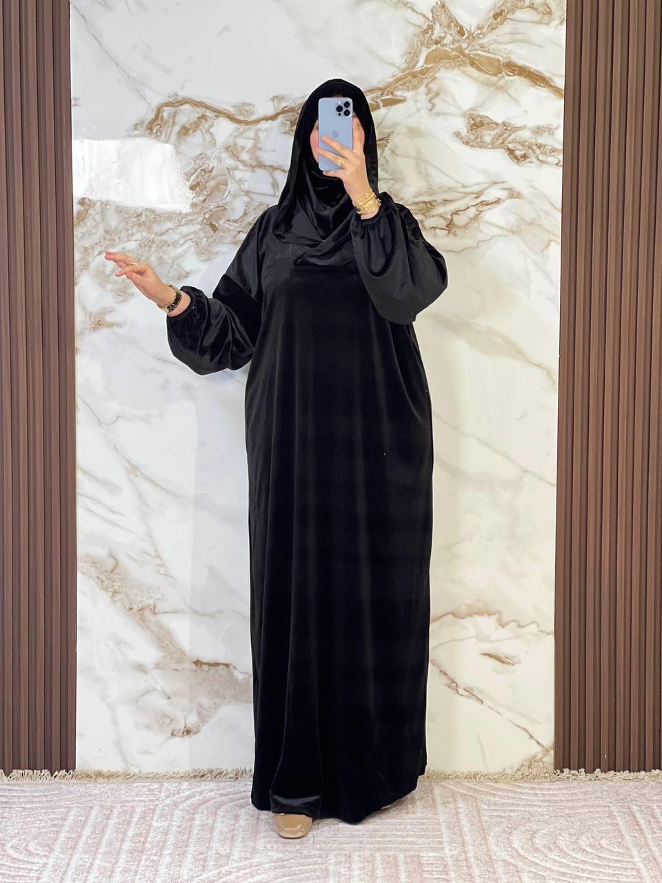 تصميم واسع ومريح يوفر دفئاً مثالياً في الأيام الباردة، مع أكمام مطاطية عملية، ما يجعلها خياراً مثالياً للصلاة، الزيارات العائلية، والاستعداد الأنيق لشهر رمضان المبارك.