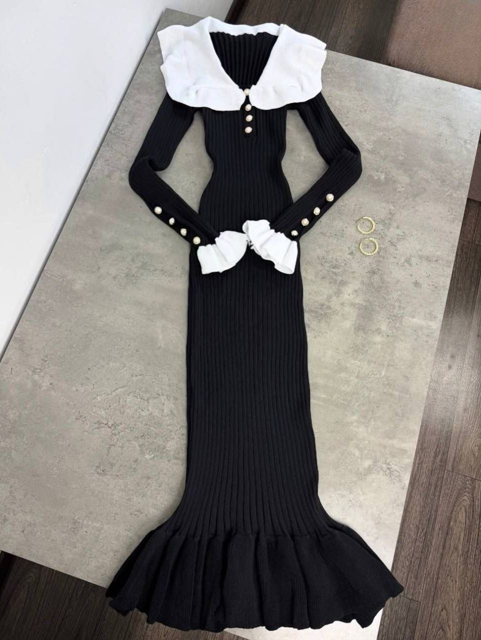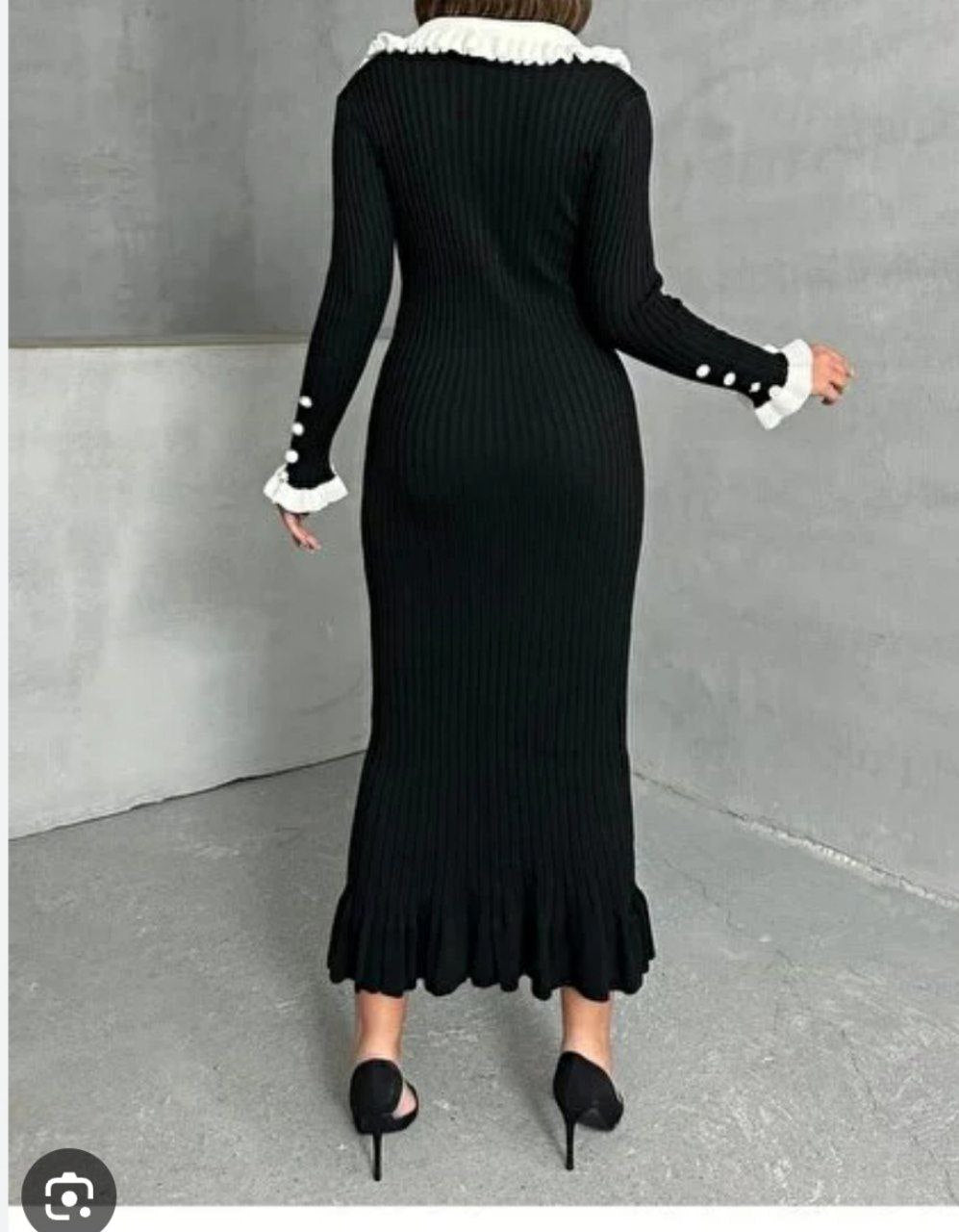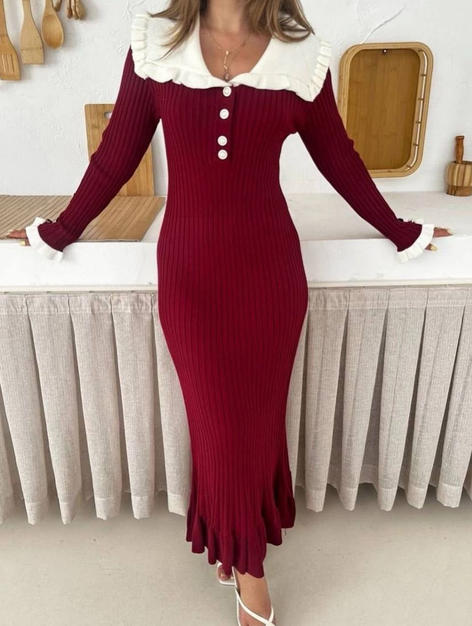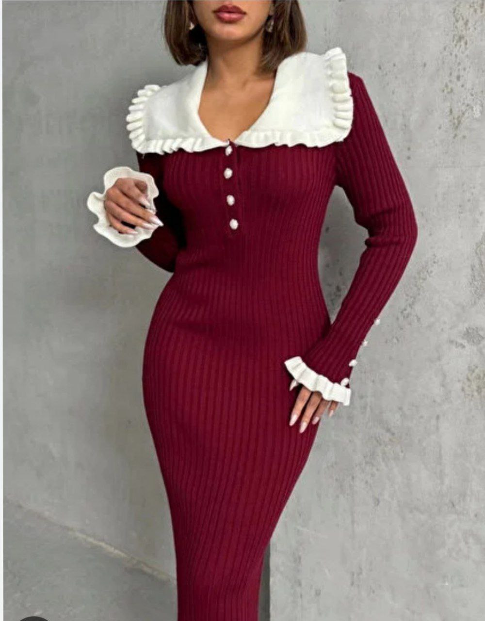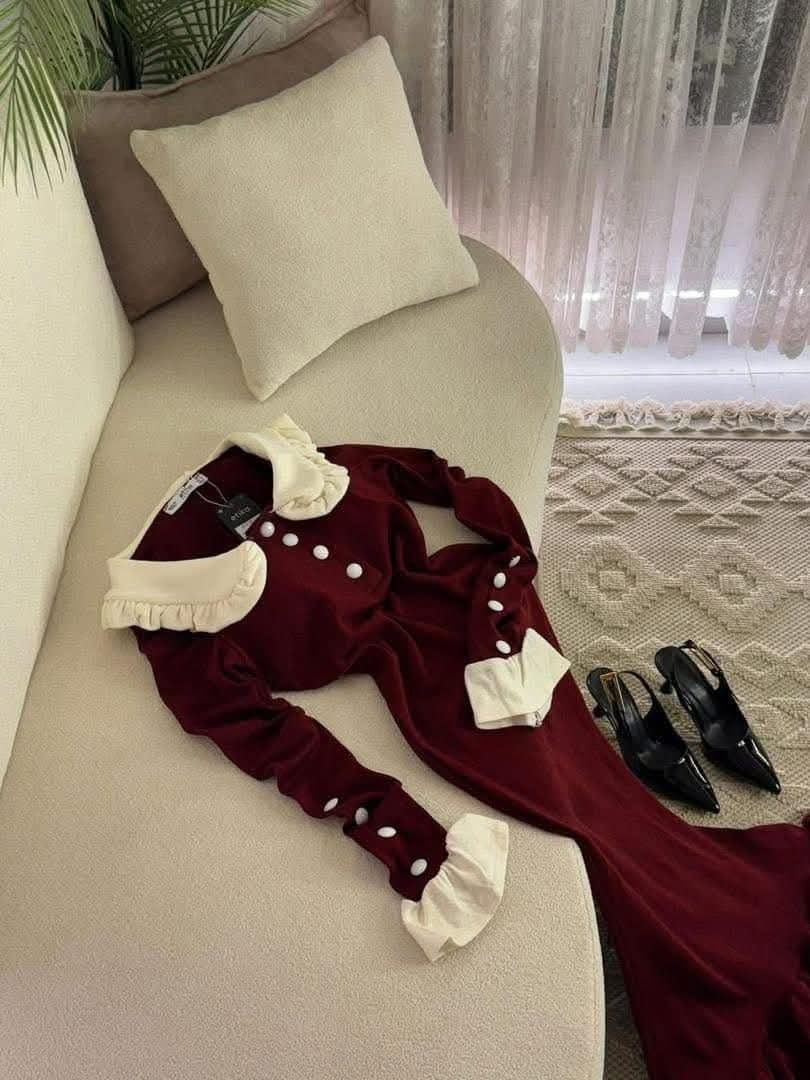 ياقة واسعة مجعدة باللون الأبيض: تضفي لمسة رومانسية مع أزرار لامعة وكوماندوز مزخرفة على الأكمام الطويلة لإطلالة كاملة التميز.